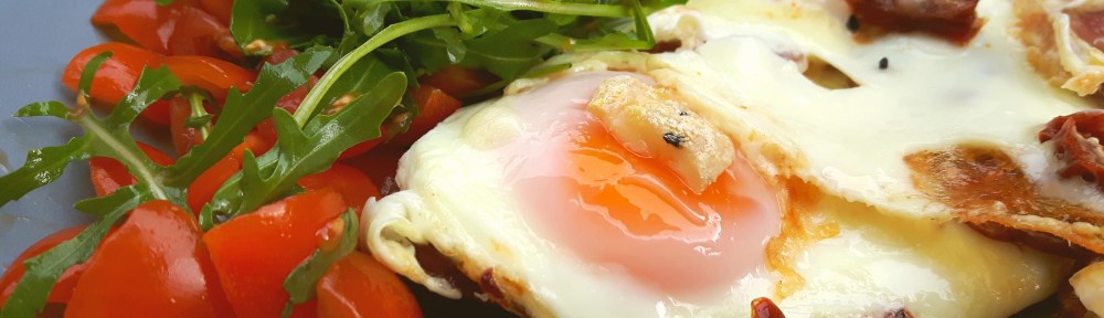 Așadar: tai cârnăciorii felii (în cazul de față, din ăia cu cașcaval), îi arunci în tigaia încinsă cu vreo 2 lingurițe de ulei în ea. Spargi cele două ouă peste ei, reduci focul și pui un capac. Dacă vrei. Dacă nu, e bine și fără, dar mie așa îmi place. Când sunt gata, sfărâmi un pic de brânză pe deasupra, și le dai cu sare și piper. Tai două roșii, le dregi cu sare, piper, cimbru, ulei, ce mai vrei tu, iei o felie de pită (dacă nu ții la siluetă) și mănânci cu poftă.
