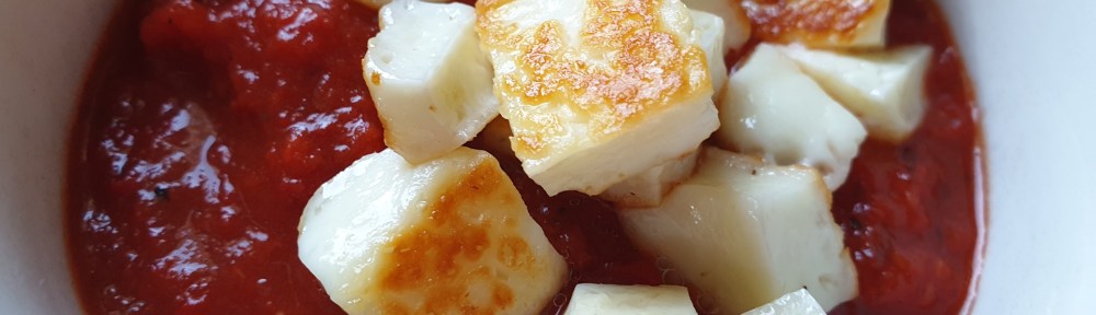 Iei trei roșii bine coapte, le tai în două și le dai la cuptor, sub grill, cu sare, piper și oregano. Iei vreo doi ardei copți care au scăpat de salată. Le arunci în chopper. Frigi niște cubulețe de haloumi. Ieși pe balcon și mănânci. Scrii o nerețetă. Gata.