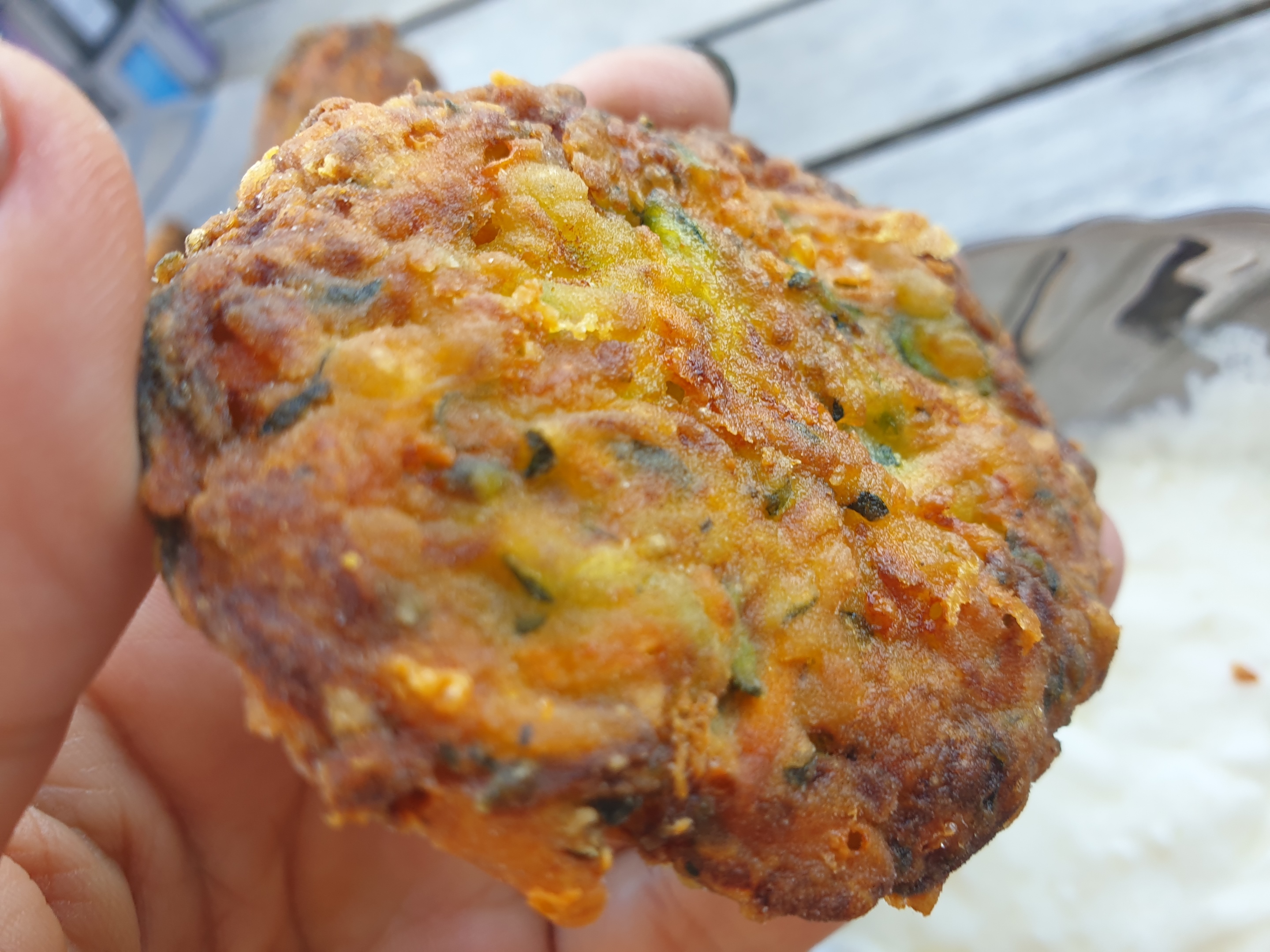 Sărat dovlecelul ras, lăsat până razi restul, stors, amestecat. Bătut ouăle, turnat peste dovlecel, adăugat treptat făina. Modelat cu mâinile înfăinate (deloc distractiv). Prăjit. Halit. Cu sos de iaurt cu usturoi, sare și ulei.