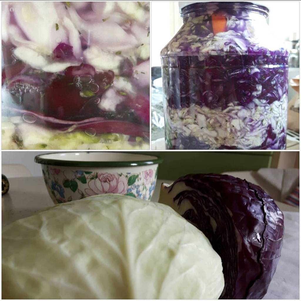 Se ia niște varză (în cazul de față, roșie și albă), de preferat mai subțire la foi. Se toacă (pe mandolină sau gilău), că o să ne ia mama găii dacă ne chinuim cu cuțitul. În plus, sare neiodată, cimbru și mărar. Am auzit că unii pun, după metoda nemțească, și chimen. Merită încercat, zic eu. Și, data viitoare când mai fac, pun și ardei iute, pe lângă ceva hrean.