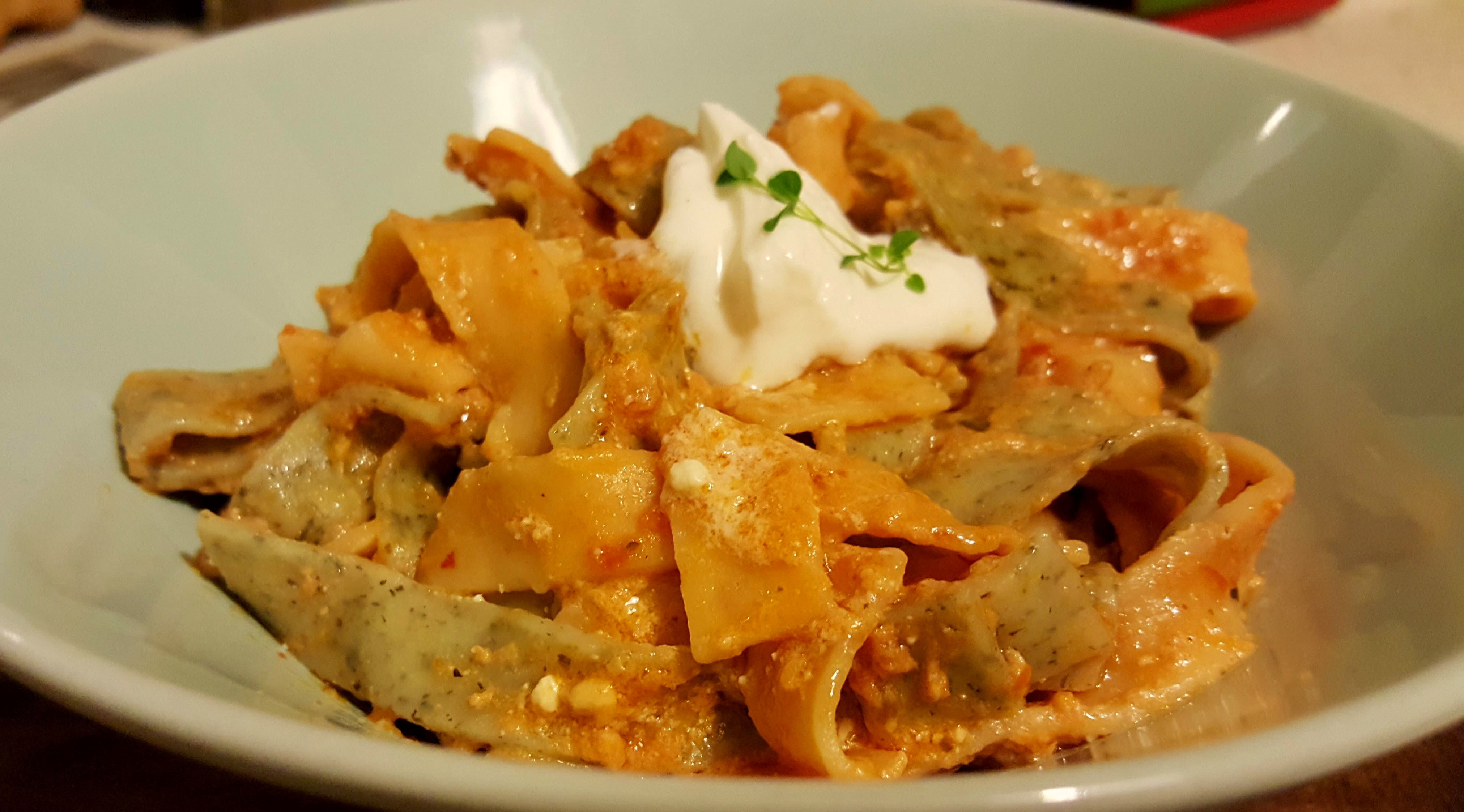 Până fierbe apa de paste, se face dovlecelul bine spălat tăiței cu scula de curățat cartofi. Se călește în uleiul de la roșii. Se pipărează și ardeiază iute. Când sunt fierte crestele, se aruncă peste dovlecel crema de telemea și roșiile mărunțite, se amestecă, se adaugă pastele scurse și se amestecă. La nevoie, se sărează. După care, evident se mănâncă. Dacă mă întrebați pe mine, îi lipsea puțin morcov, dar a fost foarte bun și fără.
