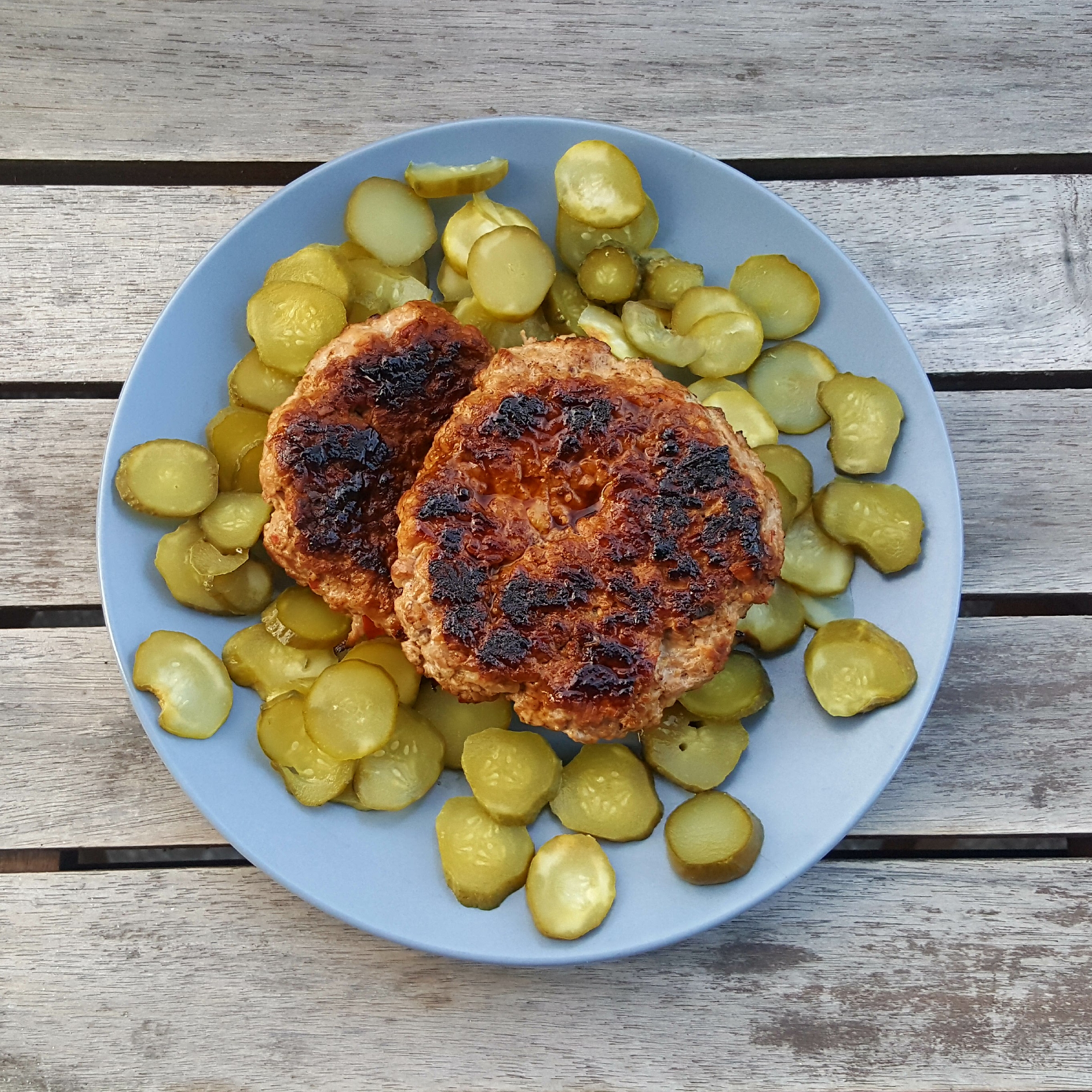 Se frământă toată distracția asta până vi se pare că se ține laolaltă, se fac două chifteloaie plate și cu un buric la mijloc, ca să nu se umfle când se strâng, se dau în tigaia de fontă încinsă și se mănâncă cu castraveți murați în saramură din borcanul de testare. Care-s mi-nu-naaaaați!