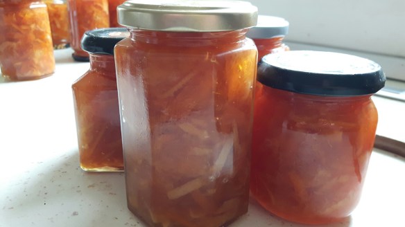Cu mici variațiuni de pe la britanici. Spre deosebire de versiunea anterioară, de data asta au fiert coaja portocalie tăiată fâșii în sirop de zahăr  (300 ml apă, 250 g zahăr), și, când s-a legat siropul, au turnat restul portocalelor roșii portocalii (2kg) curățate de coaja albă și tăiate în jumătăți de felii (adică tăiate pe la mijlocelul dolofan și desfăcute în felii) și restul de zahăr (1,5 kg).