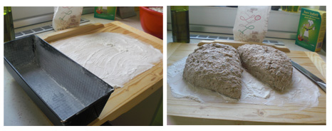 A trecut jumătatea de oră? Buuuun. Ne pudrăm pe mâinile cele îndemânatice, scoatem aluatul din castron, îl tăiem în două părți egale, formăm două rulouri pentru tăvile de cozonac sau două bile, dacă avem doar foaie de copt și tavă de aragaz. În ultimul caz, lăsați spațiu între cele două viitoare pâini. Vor mai crește și la dospit, și au nevoie de loc la copt.