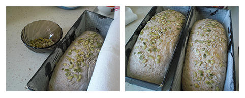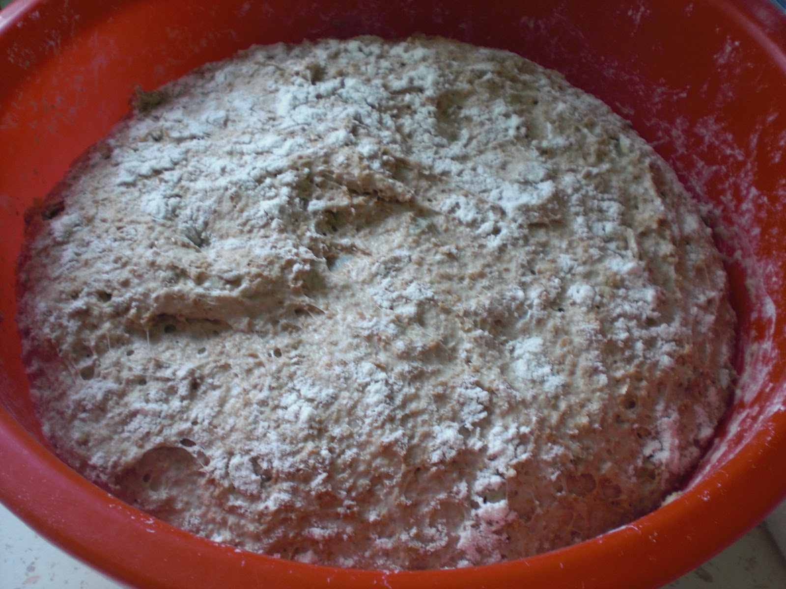 Turnăm făina, sarea și semințele într-un castron suficient de mare, le amestecăm și apoi formăm un crater în mijloc. Atențiune, națiune:  pâinea își dublează volumul la dospit, deci castronul trebuie să fie cu cel puțin un lat de palmă mai înalt decât nivelul făinii.  Amestecăm drojdia cu zahărul până se lichefiază. Zahărul, pare-se, activează drojdia, dacă oi mai ști ceva chimie (sau biologie?). O turnăm în crater, și mai adăugăm jumătate de pahar de apă călduță și așteptăm până face spumă. Eu cronometrez cu o țigară. Cine-i cuminte și nu fumează, să aștepte 5-7 minute.