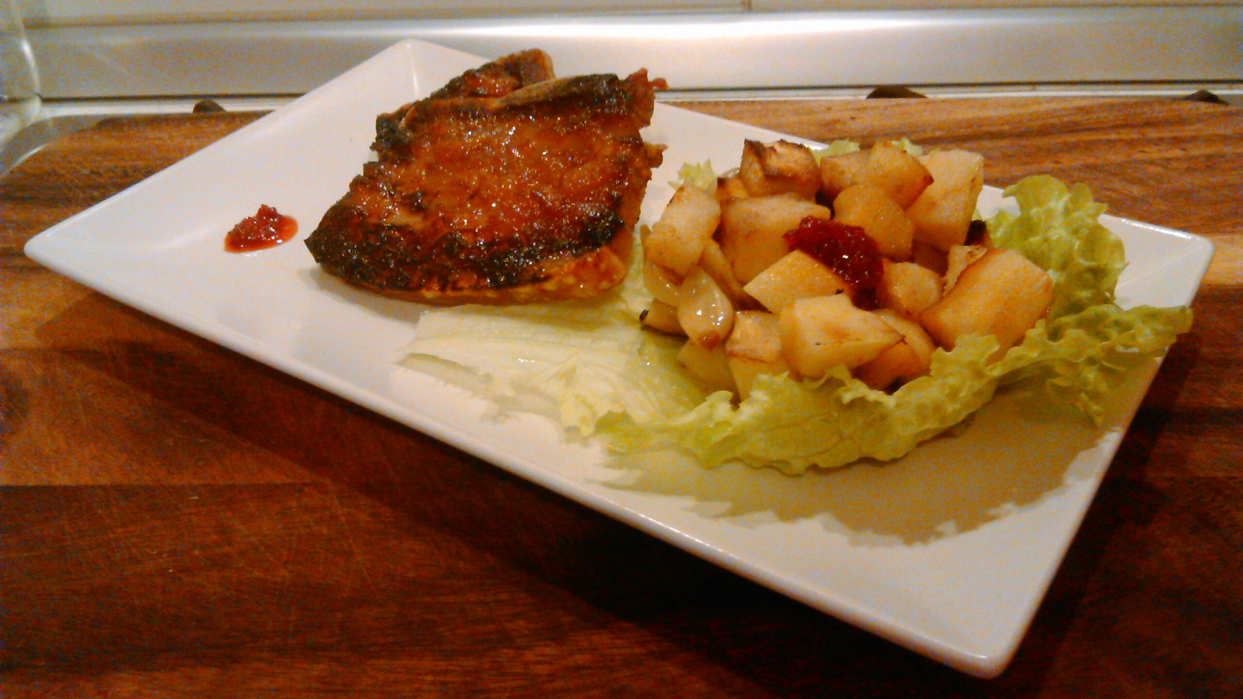 • purcelul sărat și pipărat, trântit pe deasupra, uns cu falsul chutney din dulceață de portocale dată prin blender cu oțet de mere