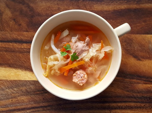 Când clocoteşte, reduceţi focul şi introduceţi carnea-n oală. După ce dă iar în clocot, adăugaţi zarzavatul, varza murată şi şoriciul. Fierbeţi până se desprinde carnea de pe oase. Scoateţi oasele. Adăugaţi bucăţile de cârnaţi. Acriţi cu moare de curechi, după gustul propriu. Până mai dă şi moarea un clocot şi fierb şi cârnaţii, dezbrăcaţi oasele de carne. Dacă n-aveţi câine, să ştiţi că tot ce rămâne pe oase e vama pentru bucătar şi se poate ronţăi în voie. Aruncaţi carnea de pe oase înapoi în zamă. Gustaţi. Dacă mai vreţi să acriţi, mai adăugaţi moare. Dacă nu e suficient de sărată, mai adăugaţi sare. Degresaţi. Eu prefer să las zama la răcit până se sleieşte grăsimea şi abia apoi să scap de grăsimea solidă.