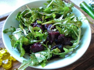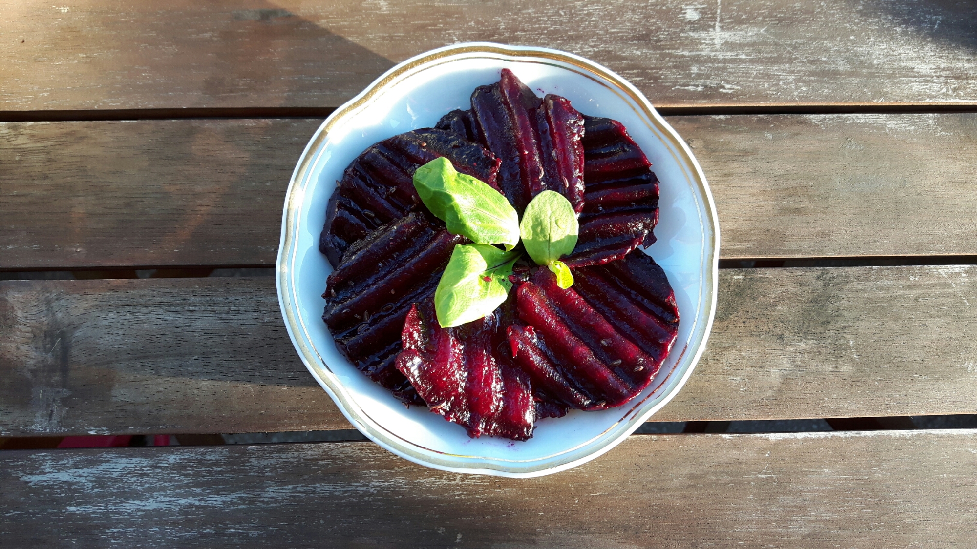 Și o salată creață și sfeclă roșie dulce și fragedă, din care ai să comiți o improvizație, cu vinegretă din muștar, oțet de gutui, gem de zmeură, un vârf de sare și ulei presat la rece (tot de la piață, de acum două săptămâni).