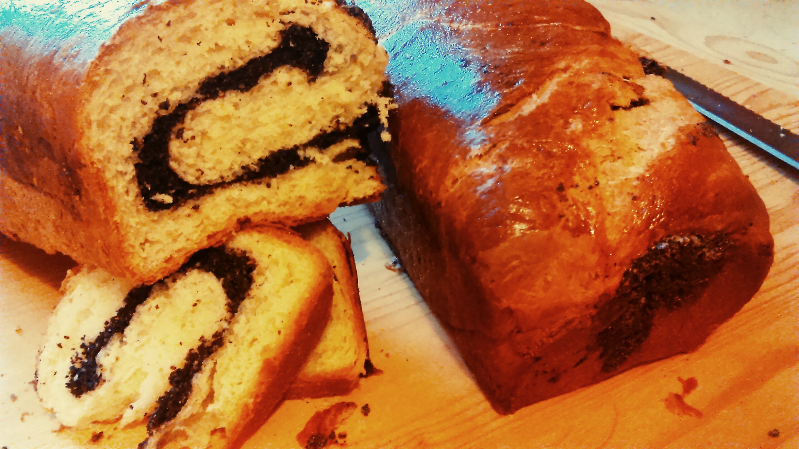 Verificăm dacă și-a dublat aluatul volumul. Probabil că da. De aia, îl scoatem pe o planșetă pudrată cu făină. Îi dăm formă de dreptunghi și îl întindem cât e tava de cozonac de lungă, pe latura îngustă și cât iese pe latura lungă. Dacă avem planșetă mică, așa ca mine, ar fi bine, probabil, să împărțim aluatul în două, dar n-a fost foarte rău nici așa. După ce l-am întins bine, îl tăiem în două și îl ungem cu umplutura. Dacă vrem să nu iasă din cozonac (cum au pățit unii, aici de față), lăsăm liber vreun centimetru pe margine și rulăm fără să apăsăm. Facem tot posibilul să închidem capetele și să nu ne iasă toată umplutura pe dedesubt. Punem suciturile în tavă, cu încheietura în jos. Le mai lăsăm la dospit în tavă, tot la căldurică. S-au dublat? Le ungem cu ou bătut, le dăm la cuptor (încălzit dinainte la foc mijlociu, vreo 160 de grade) și le lăsăm acolo vreo 50-60 de minute. Puteți să deschideți cuptorul după vreo 20, ca să întoarceți tăvile, dacă știți că merge mai tare pe o parte sau alta.